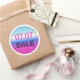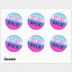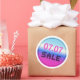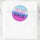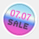 07.07 vente autocollant rond avec dégradé holographique brillant, couleur rose vif et police pointillée noire