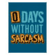 A bold and witty poster featuring the phrase "0 Days Without Sarcasm" in a playful, eye-catching design. The background is a cool shade of blue, complementing the sharp and humorous tone of the message. Perfect for adding a touch of sarcasm and personality to any space.
