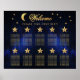 Un tableau de 10 tables mariage pour un thème mariage céleste, avec la lune et l'étoile sur un arrière - plan bleu nuit étoilé. Les numéros de table sont écrits dans de grandes étoiles dorées. La lune, les étoiles et le sont dorés. Le mot Welcome est écrit dans un élégant script calligraphique. La photo de nuit étoilée est de Felix Mittermeier de Pixabay et est gratuite pour un usage commercial.