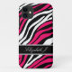 Coque iPhone 5 personnalisé et élégant avec votre nom, et conçu avec un motif d'impression zèbre avec des rayures zèbres noir, blanc et rose fuchsia chaud.