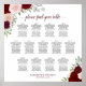 Ce beau tableau de 13 places mariage présente un design boho chic rustique avec des roses aquarelles peints à la main dans les tons bordeaux, rouge et rose roux, entouré de feuilles eucalyptus et de verdure du jardin. L'arrangement traditionnel a une place pour 130 noms avec 10 sièges par table. Le titre est écrit en calligraphie script élégante, et il y a de l'espace pour les noms du couple et mariage date ci-dessous. Une façon merveilleuse d'ajouter beauté et style à votre réception tout en facilitant la recherche de sièges par vos invités.