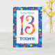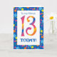 Une carte d'anniversaire 13ème anniversaire lumineuse et colorée pour un ami, avec des numéros rayés et une bordure étoilée, d'un design numérique de Judy Adamson. Vous pouvez modifier le message intérieur si vous le souhaitez.