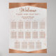 Ce tableau de sièges mariage de 14 tables combine plusieurs tendances de 2019 : géométrique, marbre, métal (cuivre) et polices spéciales (un élégant script calligraphique). L'arrière - plan est en marbre blanc. Sur les bords haut et bas, il y a du cuivre faux métallique, formant des angles et un hexagone irrégulier de marbre blanc. Les noms de la mariée et du marié et le titre Bienvenue sont écrits dans un élégant script calligraphique. Tout le texte a une couleur rouge-brun, comme le cuivre.