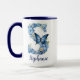 Un mug café personnalisé dans des tons de bleu avec un papillon coordonné, présentant le monogramme de la lettre "A". Personnalisez-le facilement avec votre nom ou créez un cadeau unique pour vos proches. Suffisamment d'espace pour ajouter une citation ou un message supplémentaire ou même un arrière-plan. Ce mug est également disponible dans différents styles et combinaisons de couleurs. Parcourez la collection pour voir des exemples de ce type de police sur les différents styles et tailles de tasses.