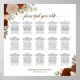 Ce tableau de 15 places mariage présente un beau design boho chic floral avec des roses d'aquarelle peints à la main, des feuilles d'eucalyptus et des feuillages de jardin dans les tons d'automne de la pêche corallienne, de l'orange rouille et du nombre brûlé. Il y a un élégant titre de calligraphie de script et des assignations de sièges pour 150 personnes avec 10 sièges par table, avec espace pour les noms du couple et la date mariage en bas. Une façon merveilleuse de faciliter la recherche de tables par vos invités.