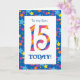Une carte d'anniversaire 15e pour un Fils, brillante et colorée, avec des numéros rayés et une bordure étoilée, d'un design numérique de Judy Adamson. Vous pouvez modifier le message intérieur si vous le souhaitez.