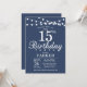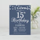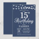 Invitation du 15e anniversaire avec lumières à cordes. Arrière - plan bleu. Anniversaire enfant. Garçon ou fille Lady Elegant anniversaire Invitation. 13ème 15ème 16ème 18ème 20ème 21ème 30ème 40ème 50ème 60ème 70ème 80ème 90ème 100ème, Tout âge. Pour plus de personnalisation, cliquez sur le bouton "Customiser" et utilisez notre outil de conception pour modifier ce modèle.