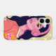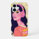 Illustration de dessin animé dynamique et stylisée d'une jeune femme aux cheveux longs et foncés, portant un gros casque rose et un t-shirt rose qui dit "GOOD VIBES ONLY" dans une police rétro jaune vif. Elle a une ombre jaune frappante et un rouge à lèvres rose, et une fleur margueuse est cachée derrière son épaule. L'arrière - plan est un beige doux aux étoiles jaunes, qui renforce le joyeux thème rétro.