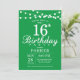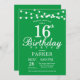 16e anniversaire Invitation avec lumière à cordes. Arrière - plan vert.Anniversaire enfant. Invitation anniversaire élégante de la fille ou du garçon. 13e 15e 16e 18e 20e 21e 30e 40e 50e 60e 70e 80e 90e 100e, n'importe quel âge.