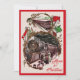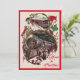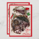Cette invitation à la fête de Noël montre une image du début des années 1900 de gens se rassemblant dans la gare et voyageant dans un train à l'ancienne pour rentrer chez eux pour les vacances de Noël. Drapeaux rouges, blancs et verts pour des décors festifs.