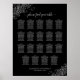 Ce magnifique tableau de sièges mariages propose des assignations de table pour 190 personnes, avec 10 personnes à chaque table. Le design est simple mais élégant avec du texte gris pâle sur un arrière - plan noir. Il y a des boucles et des tourbillons en faux feuille d'argent en dentelle dans les coins et la calligraphie de script fantaisie lisant "s'il vous plaît trouver votre table."