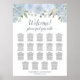 Le tableau de sièges pour un mariage est un design de 19 tables qui présente un motif floral sophistiqué, avec une pléthore de roses d'aquarelle peints à la main, de fleurs et de feuillage dans des teintes douces bleu poussiéreux et vert sauge. Le titre du graphique, écrit en calligraphie cursive délicate, dit : "Bienvenue ! S'il vous plaît, trouvez votre table." Le graphique comprend également des espaces pour les noms du couple et la date du mariage. Il a été conçu pour accueillir 190 convives, avec une table de 10 places assises.