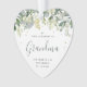 Des neiges peintes à la main et des tiges d'eucalyptus forment une bordure en haut de cet ornement en forme de coeur. Tout le texte est entièrement modifiable de sorte que vous pouvez facilement modifier le libellé et modifier le style/la couleur/la taille/le placement de la police. Remplacez la photo modèle au dos par la vôtre.