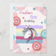 Invitation de 1er anniversaire avec une adorable illustration d'une licorne sur un arrière - plan rayé coloré avec des bonbons.