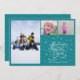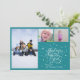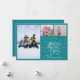 Cette carte à plat Noël / Vacances a un arrière - plan rayé bleu défraîchi avec trois spots pour vous d'ajouter vos photos de famille personnalisées! Au milieu, il y a un design de typographie blanche avec beaucoup d'étoiles blanches. Le texte dit : "Joyeux Noël et Bonne Année".