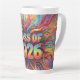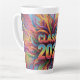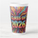 A vibrant, high-energy 3D digital illustration featuring the text "CLASS OF 2026" in the center. The text is bold, blocky, and 3D extruded, featuring a shimmering rainbow gradient face and metallic gold edges. Bursting outward from behind the text is a massive explosion of thick, smooth, colorful wavy ribbons in vibrant shades of pink, blue, yellow, green, purple, and orange. The background is a soft, glowing rainbow gradient. Floating around the text are small festive elements like confetti, tiny 3D stars, and glowing dots. The overall aesthetic is celebratory, maximalist, intensely colorful, and cheerful.