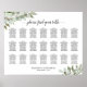 Ce tableau contient les assignations de tables pour 210 personnes à 21 tables, avec 10 invités ou noms par table. La belle aquarelle peinte à la main présente des feuilles d'eucalyptus, de la verdure et du feuillage dans les tons menthe, mousse et vert sauge. Belle façon d'aider vos invités à trouver la bonne table à votre réception de mariage. Le titre dit "s'il vous plaît trouvez votre table" dans élégante calligraphie de script.