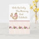 Cette jolie carte présente un poulet design en rose, vert et beige. Le poulet se tient sur un mur en chevron avec une bordure de fleurs au centre. Merci à hungryjpeg pour certains des éléments du design.