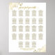 Ce tableau de sièges mariage propose des assignations de table pour 230 personnes, avec 10 personnes à chaque table. Le design est simple mais élégant avec frilly or faux boucles et tourbillons dans le coin et élégante calligraphie or lisant "s'il vous plaît trouver votre table" sur un arrière - plan blanc.