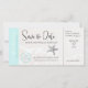 Carte d'embarquement à la plage, 25e anniversaire du mariage enregistrez la date ou l'invitation à une célébration de plage. Modifiez le texte et les détails comme vous le souhaitez sur cet élégant enregistrer la date d'embarquement faire-part. Carte d'embarquement design de bord de mer aux doux accents turquoise tropicaux et étoiles de mer.
