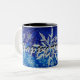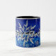 Beaux flocons de neige en argent et blanc sur un arrière - plan de bleu de multi-ombre. Est bonnes fêtes la salutation sur cette tasse.