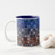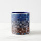 Cet extérieur de cette tasse comporte une couverture à crochet de carré de mamie dans les bruns arénacés, les gris rocheux, et les bleus d'océan du Maine côtier. L'intérieur est un gentil, profond, bleu marine.