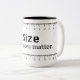 Attaquez avec une règle au dessus et au bas. Le dessus est en pouces, le fond est en centimètres et les mots "taille vraiment importe". Image en noir et blanc.