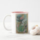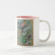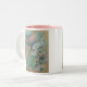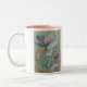 Cette tasse à deux tons comporte un dessin en pastel d'un colibri et d'une mite parmi des fleurs. Les couleurs sont des verts majoritairement doux, des bleus et des roses. Cette conception semble la meilleure sur une tasse blanche pure, un à deux tons avec l'intérieur rose ou vert-foncé, ou une tasse de sonnerie avec la poignée et la jante vert-foncé.