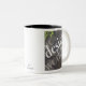 Tasse de café blanc avec le noir à l'intérieur de et la typographie élégante indiquant (graphique) le "travail de conception !" Un flourish de feuille vert ajoutent une peu de couleur contrastante.