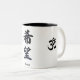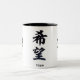Le symbole de kanji pour l'espoir orne cette tasse de café/thé. Les symboles de l'OM sont également de chaque côté du symbole de kanji. Ces tasses sont disponibles dans beaucoup de styles, de tailles et de couleurs. Appréciez et Namaste.