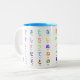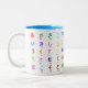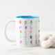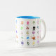 Tasse blanche avec chacun des 46 symboles japonais de hiragana. Prononciation dans l'alphabet au-dessous de chaque caractère.