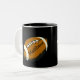 Cette tasse de cool comporte les football bruns et blancs volant par l'air. Personnalisez facilement le texte pour une fan de sports spéciale ou l'enlevez entièrement. Customisez l'arrière - plan foncé à la couleur de votre choix.