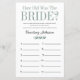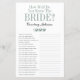 Cette charmante feuille de jeux de douche de mariage avec "Quel âge avait la mariée?" sur le devant et "Connaissez-vous bien la mariée?" au dos est simple et charmante - parfaite pour votre douche. Ces jeux amusants et faciles sont sûrs d'apporter beaucoup de rires à votre douche de mariage! Demandez à la famille et aux amis de vous envoyer des photos de la mariée à différents âges et faites-les imprimer. Numérotez-les et placez-les près de ces feuilles de jeu. Donnez simplement une feuille à chaque invité (n'oubliez pas les stylos) et laissez la compétition commencer pour le premier jeu! Vous serez étonné de savoir combien de personnes connaissent vraiment l'âge de la mariée. Ensuite, retournez la feuille et donnez aux invités 5 minutes pour répondre aux questions. Vous découvrirez qui connaît vraiment la mariée. En quelques secondes, vous pouvez voir à quoi ressemblera