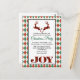 Carte postale d'invitation à la fête de Noël avec illustration du saut de 2 cerfs de Noël. Les cerfs sont faits de sériole rouge et noire, avec un peu de coeur entre eux. Joie écrite en bas. L'arrière - plan est un motif Jacquard rouge et vert.