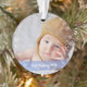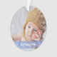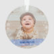 Branché, élégant mais aussi mignon Premier Noël Baby Girl Ornament avec une bande bleue partiellement transparente, et une image et un texte que vous pouvez personnaliser avec une photo d'un bébé garçon, son nom, et l'année de son premier Noël (ou le nom d'un autre jour férié). Sur le dos, vous pouvez télécharger une deuxième photo. Les deux photos sont placées dans un cadre chic de flocons de neige et d'étoiles.