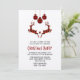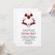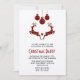 Une invitation à une fête de Noël avec une illustration de 2 cerfs de Noël sautant. Les cerfs sont faits de carreaux de bûcheron rouges et noirs, avec un petit cœur entre eux. Des décorations de Noël à carreaux rouges et noirs pendent du haut.