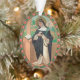 Saint Rose de Lima (1586-1617) voulait devenir une religieuse, mais son père refusa de l'autoriser. Finalement, cependant, elle a été autorisée à rejoindre le Troisième Ordre de Saint-Dominique pour vivre son apostolat chez elle. + Dans ce portrait stylisé, St. Rose se dresse à côté d'un pridieu ou d'un genièvre. Un livre ouvert était sur son étagère. Saint-Rose est habillé d'une habitude dominicaine composée d'un wimple blanc, d'une robe crème et scapulaire, d'une ceinture noire et d'un chapelet, d'un voile et d'un manteau noirs. Sur sa tête, elle porte une couronne d'épines comme Sainte Catherine de Sienne, son modèle, au lieu de son attribut habituel : une couronne de roses. (Les Roses sont toutefois intégrés dans le cadre ovale élaboré de l’image, partiellement visible ici). Dans sa main droite, elle tient un spray de lis indiquant son statut de vierge consacrée. Au-delà du mur bas qui sépare le premier plan de l'arrière - plan se trouve un paysage tropical péruvien. + Saint Rose de Lima est le premier catholique des Amériques à être déclaré saint. Elle est protectrice des jardiniers et fleuristes, ainsi que du Pérou, des Amériques et des Philippines. + Fête : 23 août + Crédit photo (K 48) : Détail d'une image antique de Saint Rose de Lima, tirée de La vie des Saints de Henry Riancey : Illairie en chromolithographie, d'aprés s les manuscrits de è sicles, par. Kellerhoven (Paris : Librairie Bachelin-Deflorenne, [187] 4]), p. 288, de la bibliothèque privée du concepteur. Franz Kellerhoven (1814-1872), le chromolithographe, est un prêtre-artiste allemand qui émigra à Paris et y installa une imprimerie. Il s'est spécialisé dans les oeuvres d'art basées sur des manuscrits médiévaux, mais il a également fait des lithos de peintures et d'oeuvres architecturales anciennes.