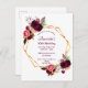 Devant : Une invitation pour une soirée élégante de 30ème anniversaire. Un arrière - plan blanc chic avec un cadre géométrique en faux or. Décoré de fleurs bordeaux foncé et rose aquarelle, de plumes roses et boho. Modèles pour un nom et les détails de la fête. Le nom est écrit avec un script de style écrit à la main, des lettres de couleur bordeaux. Dos : arrière - plan blanc.
