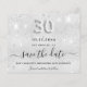 Une élégante carte Save the Date pour une fête de 30e anniversaire. Un arrière - plan moderne faux argenté décoré avec de la poussière de parties scintillant. Personnalisez et ajoutez une date et un nom/âge. Lettres de couleur grise. Le texte : Save the Date est écrit avec un grand script de style à la main tendance. Numéro 30 avec une police de style ballon.