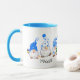 Tasse de vacances avec 3 gnomes de Noël mignons et drôles en casquette bleu. Personnalisé avec votre monogramme/nom. Concevez un pour chaque membre de la famille. Rempli de cacao, de bonbons ou de petites friandises, il fera un cadeau parfait pour les membres de la famille et les amis. Choisissez votre couleur de tasse avant de commander.