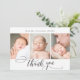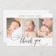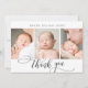 Simple Moderne Élégant Calligraphie Script 3 Photo Collage Nouveau-né Carte Faire-part de naissance Merci bébé. Dispose d'un beau texte "merci" dans une typographie ou calligraphie lettrée manuscrite swash tail script de police. Idéal pour bébé garçon ou petite fille. Le message personnel préfabriqué et les statistiques de naissance avec le nom du bébé sont inclus en noir et blanc. Facile à personnaliser avec votre photo bébé et les détails.