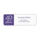Ajoutez facilement votre propre adresse aux étiquettes d'adresse de retour de 40e anniversaire avec un design typographique moderne "40 et fabuleux" avec du texte blanc sur un arrière - plan violet. Les couleurs violet arrière - plan et blanc du texte à gauche et violet à droite peuvent être modifiées en cliquant sur le bouton "Personnaliser".