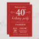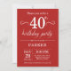 Invitation du 40e anniversaire avec l'Arrière - plan rouge. Anniversaire adulte. Hommes ou Femmes Anniversaire Invitation. 13ème 15ème 16ème 18ème 20ème 21ème 30ème 40ème 50ème 60ème 70ème 80ème 90ème 100ème, Tout âge. Pour plus de personnalisation, cliquez sur le bouton "Customiser" et utilisez notre outil de conception pour modifier ce modèle.