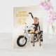 Une fille avec une moto pointant vers le message Joyeux Anniversaire. Une grande carte pour l'homme qui aime ses vélos !