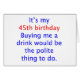 " C'est mon quarante-cinquième anniversaire, m'achetant qu'une boisson serait la chose polie à faire." La conception humoristique pour cela 45 ans qui aime inciter des personnes à rire et si une boisson libre sort de l'affaire ainsi que ce soit.