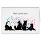 4 chats noirs en silhouette avec des yeux dorés brillant brillamment et confettis de fête dispersés tout autour.