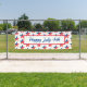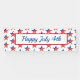 Cette bannière de vacances du 4 Juillet est présentée dans le style extérieur, Select de intérieur ou extérieur, avec ou sans grommets. Montré dans un drapeau patriotique étoiles imprimé avec le texte du 4 juillet heureux en bleu. Customisez ou achetez comme prévu. Image stock