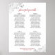 Ce beau tableau de sièges mariage de 4 tables comprend des assignations de table pour 40 personnes, avec 10 personnes à chaque table. Le design est simple mais élégant avec du texte gris et rouge sur un arrière - plan blanc et dispose d'une filigree floral dentée dans les coins et un titre de calligraphie script sophistiqué "s'il vous plaît trouver votre table." Sophistiqué et chic.