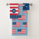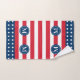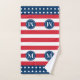 Celebrate the 4th of July in patriotic style with this coordinating bath towel set. Includes a blue bath towel with American flag pattern, a red, white, and blue stars and stripes patterned hand towel with custom monogram last name initial letter that you can personalize, and a navy blue "Happy 4th of July!" wash cloth with stylish script text design and star accents.