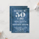 Une invitation rustique à la fête du 50ème anniversaire en burlap de lin bleu avec le type blanc qui dit applaudissements à 50 ans. Idéal pour les fêtes d'anniversaire décontractées. Convient aux fêtes d'anniversaire pour hommes ou femmes.